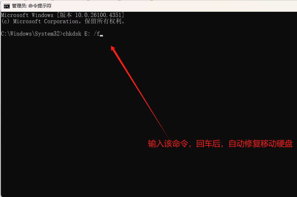 解释:chkdsk为修复工具,E: 为硬盘分区,盘符, /f为默认参数。我这里是E盘,如果您是F就换成F盘。