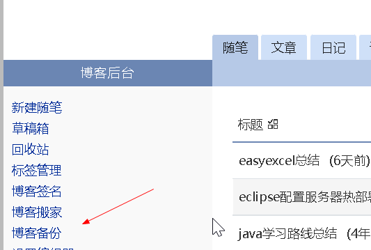 在管理功能项下,随笔,文章,日记都有对应的备份功能,在左侧就可以看到