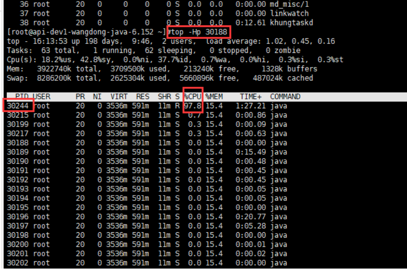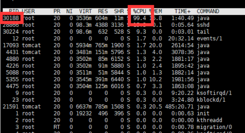 - linux服务器使用top命令查看进程,CPU占用达到100%是由进程号为30188的进程导致的