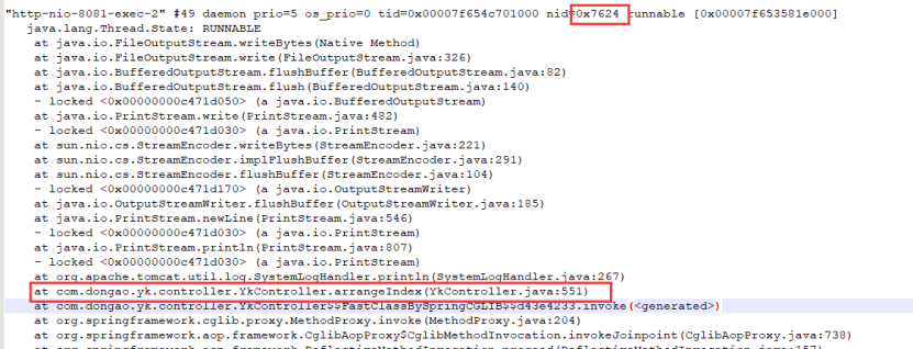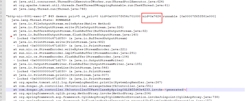 - 这时采用jdk自带的命令 jstack 进程号(在这里是 jstack 30188) 输出(dump)线程信息。其中的nid字段即为CPU占用高的线程,在dump文件中搜索7624,定位到出问题的线程,如下图所示: