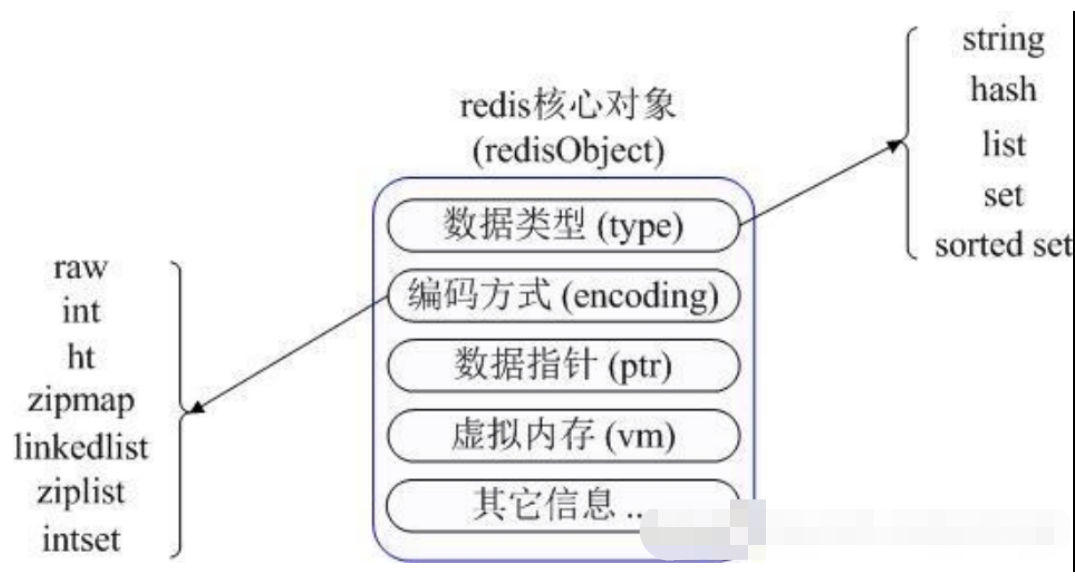 数据类型包括string,hash,list,set,sorted set。编码方式包括raw,int,ht,zipmap,linkedlist,ziplist,intset。