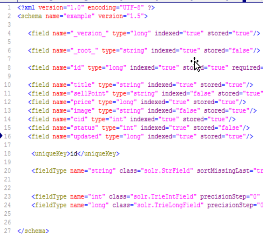 schema.xml文件里面主要定义了索引数据类型,索引字段,字段是否索引,是否存储等信息。