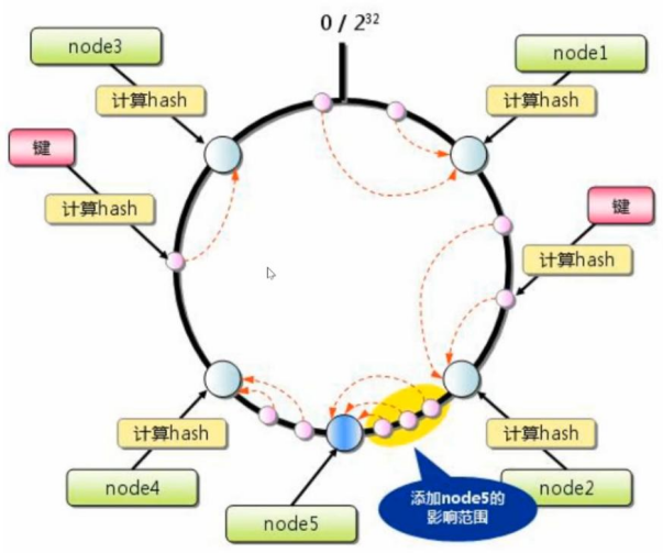 将服务器列表+虚拟节点分布在0-2的32次方的一个圆上