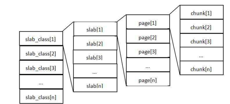 memcache存储数据的最小单位是chunk,大小相等的chunk组成了page,page默认大小是1M,多个page组成了slab;相同大小chunk的slab被组织在一起,称为slab_class