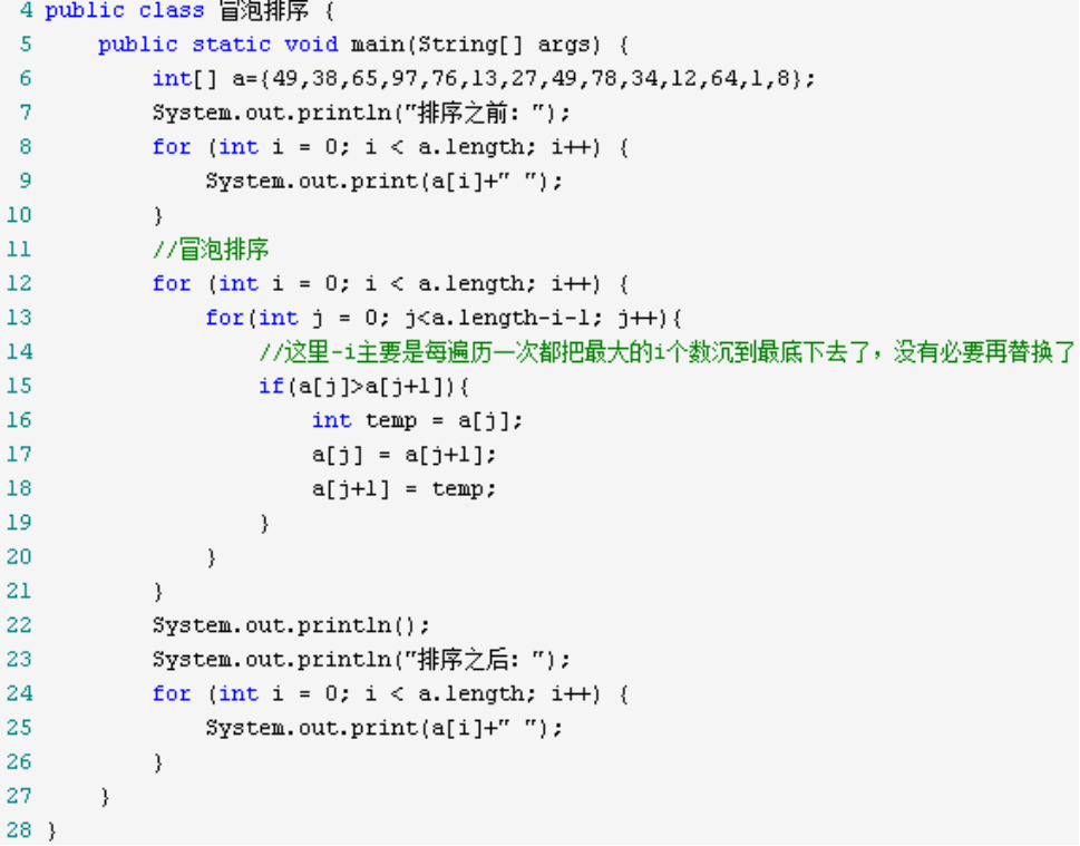 基本思想:自上而下对相邻的两个数依次进行比较和调整,让较大的数往数组后面走。即:每当两相邻的数比较后发现它们的排序与排序要求相反时,就将它们互换;内层循环走一遍最大数就到最后了(所以j<a.length-i-1)。a[j]与a[j+1]比较