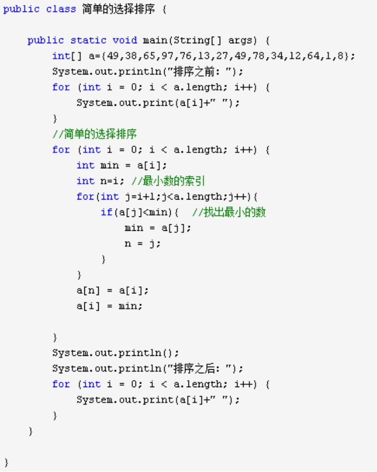//选择排序:每次选择出最小的数放到前面,遍历一次找出一个最小值
