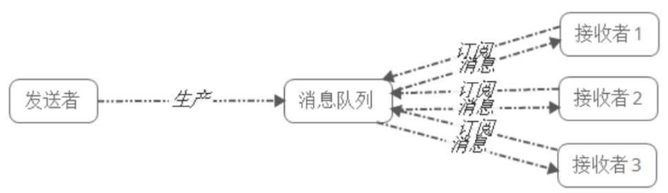 消息发送者生产消息发送到queue中,然后消息接收者从queue中取出并且消费消息。消息被消费以后,queue中不再有存储,所以消息接收者不可能消费到已经被消费的消息。