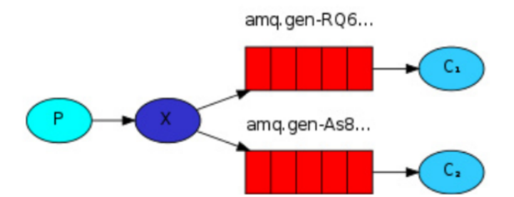 5、生产者发送的消息,经过交换机,到达队列,实现,一个消息被多个消费者获取的目的