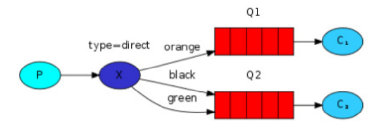 生产者定义交换机为路由类型,并在发送消息时指定key,消费者绑定交换机指定不同的key