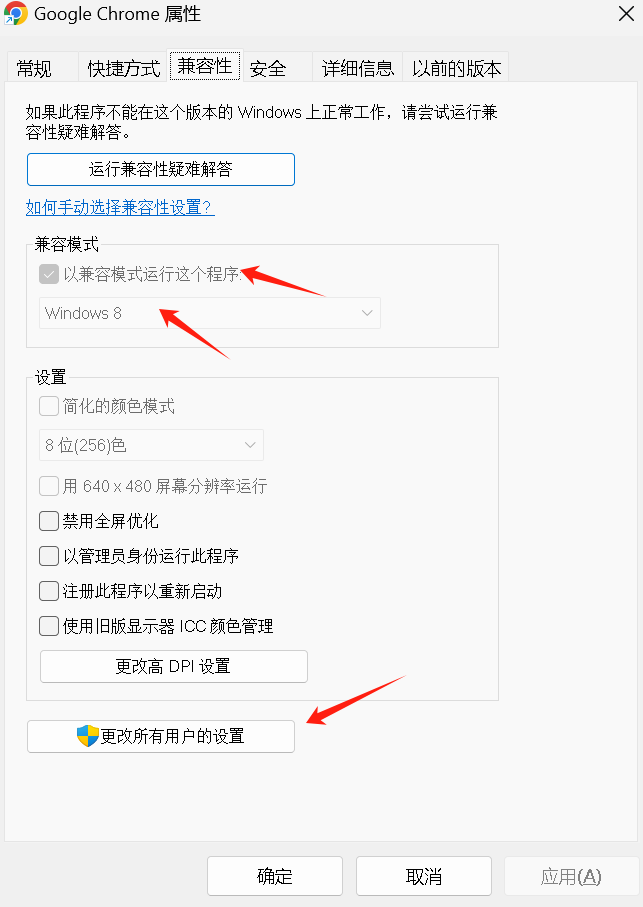 找到快捷方式,右键-属性-兼容性,勾选兼容模式和系统(win11也可以选择window8),更改所有用户的设置,点击确定后重新启动谷歌浏览器试试