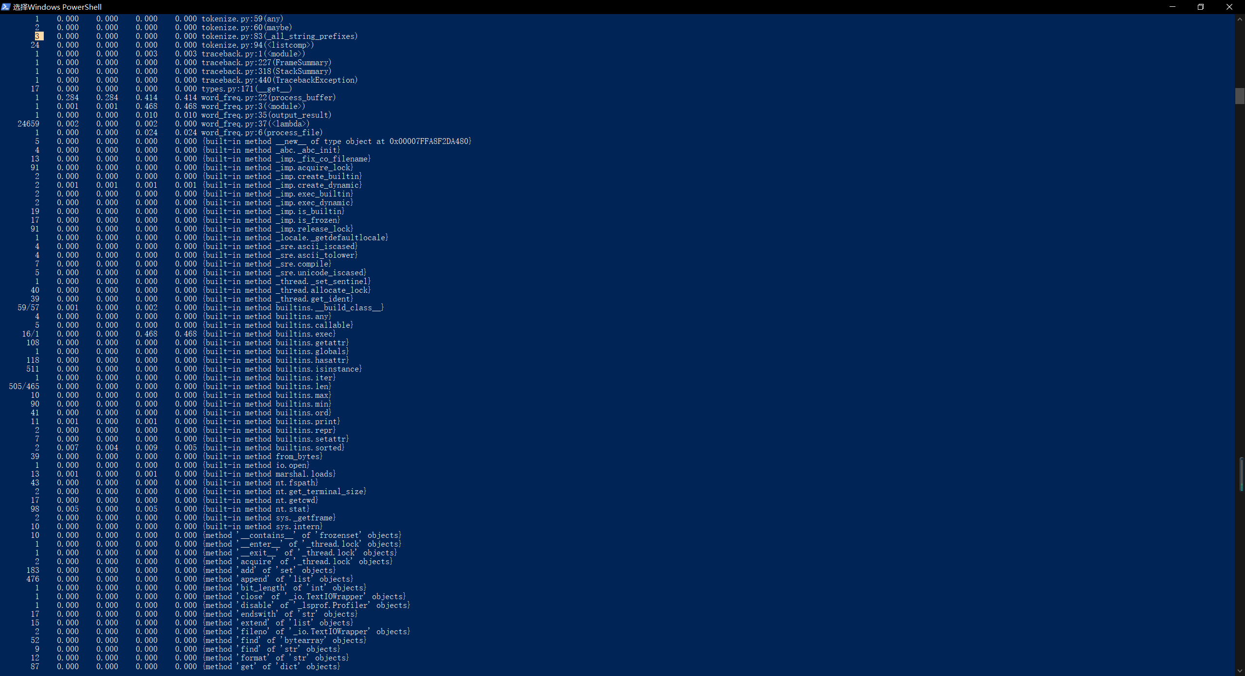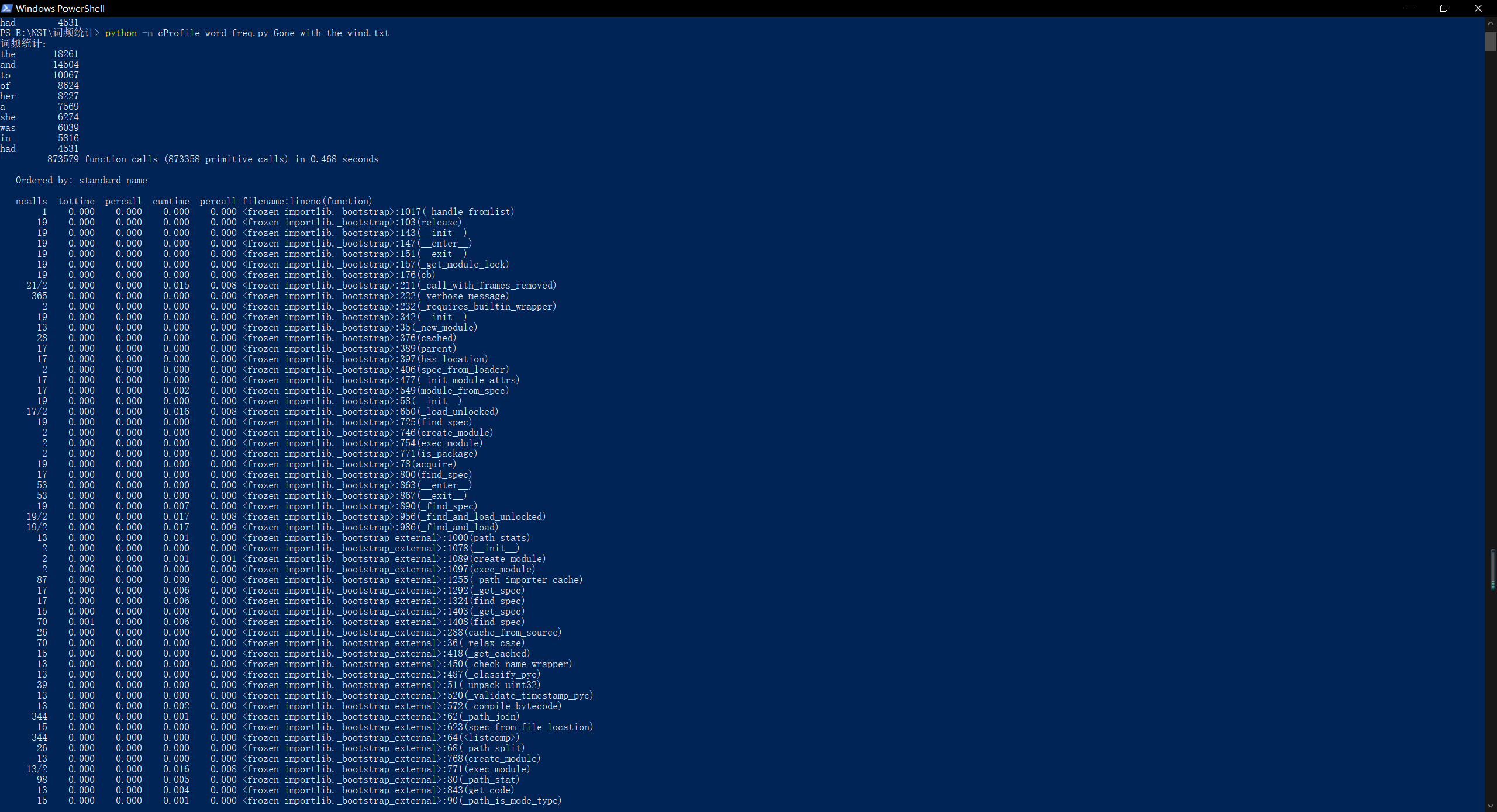 执行次数最多的代码:sorted_word_freq = sorted(word_freq.items(), key=lambda v: v[1], reverse=True) - 程序运行命令、运行结果截图以及改进后的程序运行命令及结果截图