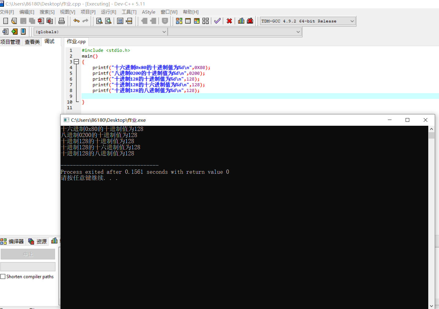 ``` #include <stdio.h> main() { printf("十六进制0x80的十进制值为%d\n",0X80); printf("八进制0200的十进制值为%d\n",0200); printf("十进制128的十进制值为%d\n",128); printf("十进制128的十六进制值为%d\n",128); printf("十进制128的八进制值为%d\n",128); } ```