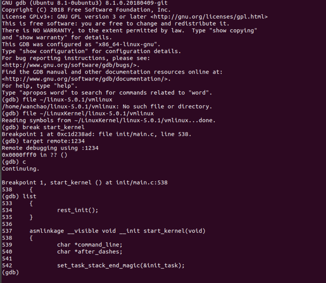 gdb file ~/linux-5.0.1/vmlinux target remote:1234 break start_kernel c list