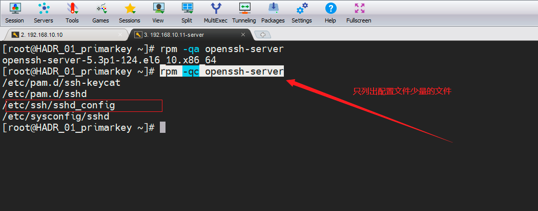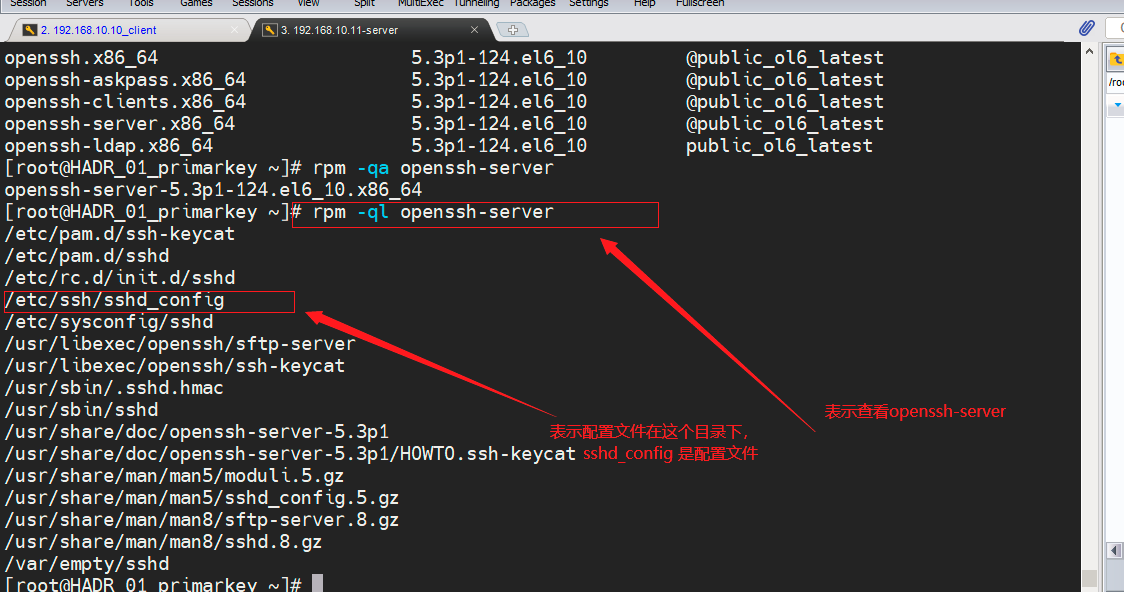 3、我们要看ssh带来的是那些配置文件,命令rpm -ql openssh-server(表示列出所有),如果只是列出配置的话用命令(rpm -qc openssh-server) 如下: