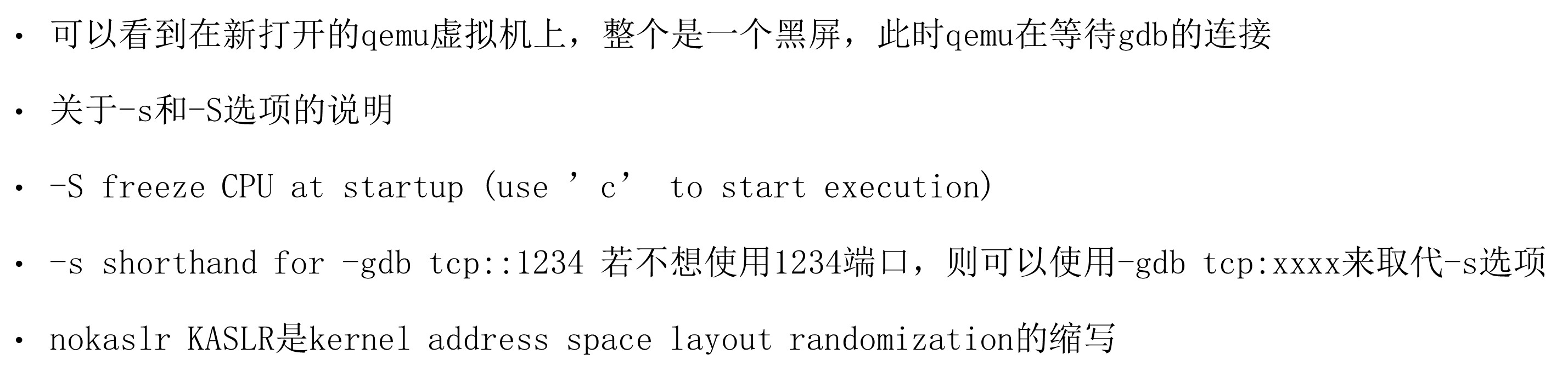 qemu-system-x86_64 -kernel linux-5.0.1/arch/x86_64/boot/bzImage -hda rootfs.img -append "root=/dev/sda init=/init nokaslr" -s -S