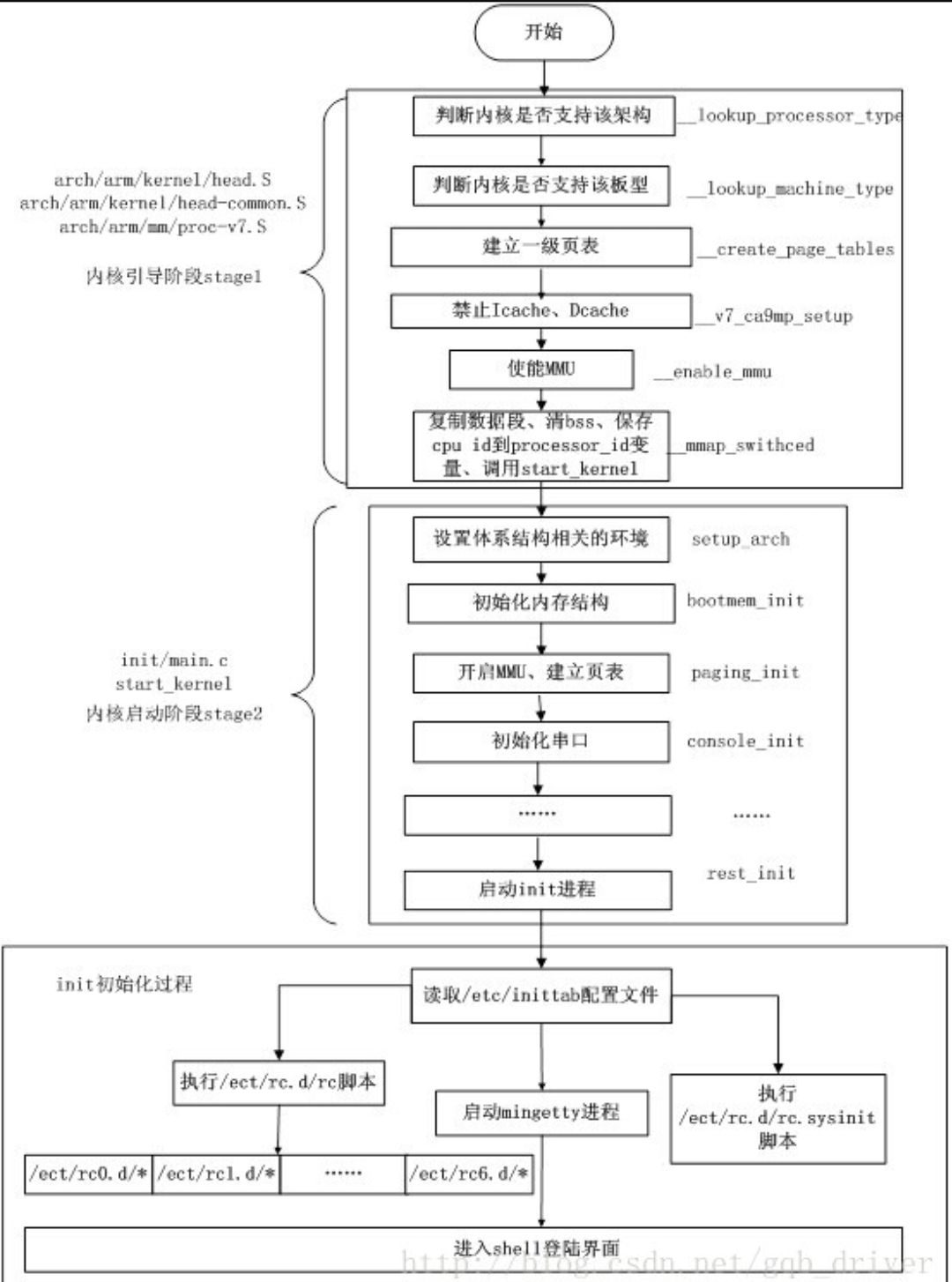 在加电启动BootLoader运行后,BootLoader对硬件初始化并把内核加载进内存然后将参数传给内核后,内核将接过系统控制权开始运行,而内核运行的第一个函数入口就是start_kernel这个入口函数。它将进行一系列初始化,其中就包括系统调用初始化,内核最后创建系统的第0号进程rest_init,它做的一件事情是从根文件系统寻找init函数作为系统第1号进程运行,rest_init则退化为系统空闲时候运行的idle进程。内核启动过程流程大致如下: