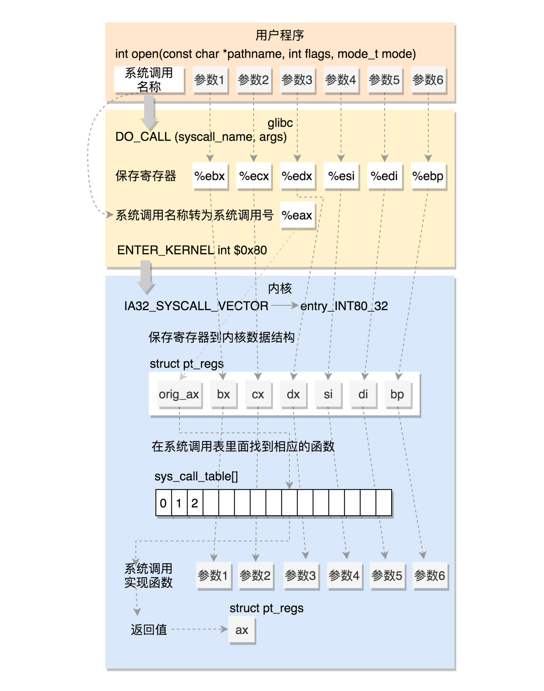 该指令会跳转到system_call中断入口在kernel/arch/x86/kernel/entry_32.S: