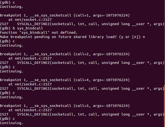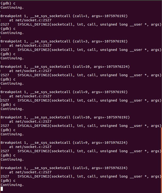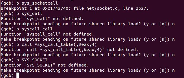gdb file vmlinux b sys_call b sys_socketcall b call *syacall_call_table(,%eax,4) b SYS_SOCKET target remote:1234