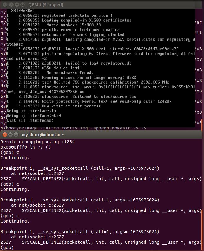 只有sys_socketcall断点成功,其他都直接编译处理掉了。继续运行内核,出现如下结果: