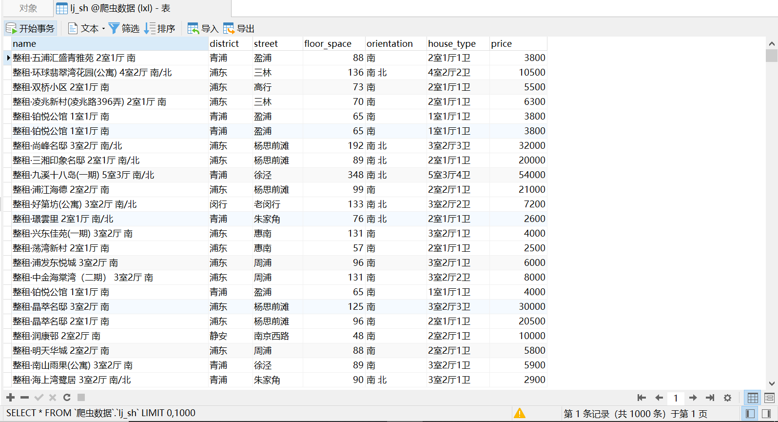 # 使用 execute() 方法执行 SQL,如果表存在则删除 s.cur.execute("DROP TABLE IF EXISTS LJ_sh") # 使用预处理语句创建表 sql = """CREATE TABLE LJ_sh( name VARCHAR(255), district VARCHAR(255), street VARCHAR(255), floor_space INT, orientation VARCHAR(255), house_type VARCHAR(255), price INT )""" # 执行sql语句 s.cur.execute(sql) # 将爬取的数据存入MySQL数据库中 for i in range(0, len(name)): sql = """INSERT INTO LJ_sh VALUES('%s','%s','%s','%s','%s','%s','%s')""" \ %(name[i], district[i], street[i], floor_space[i], orientation[i],house_type[i], price[i]) # 执行sql语句 s.cur.execute(sql) # 提交到数据库执行 s.conn.commit()