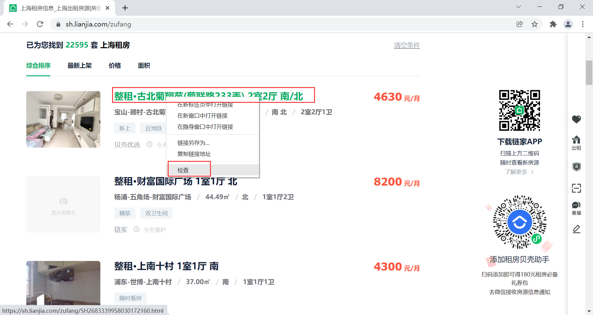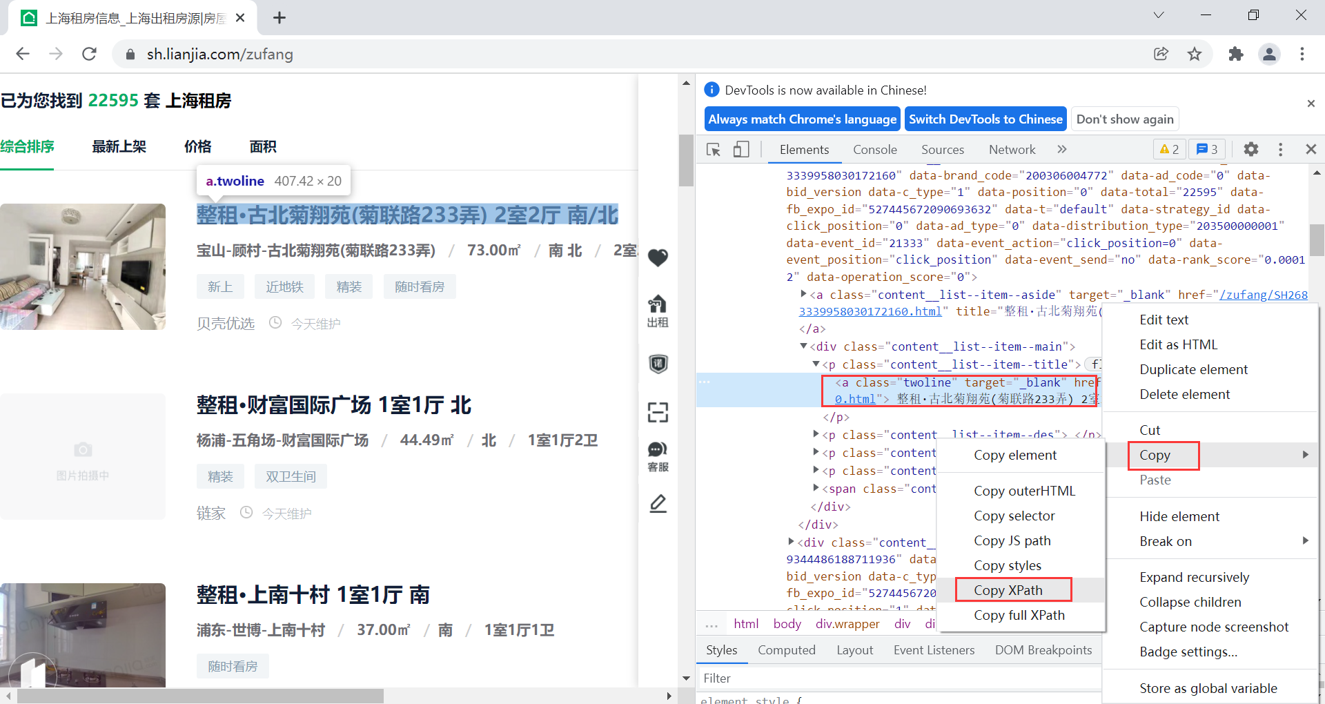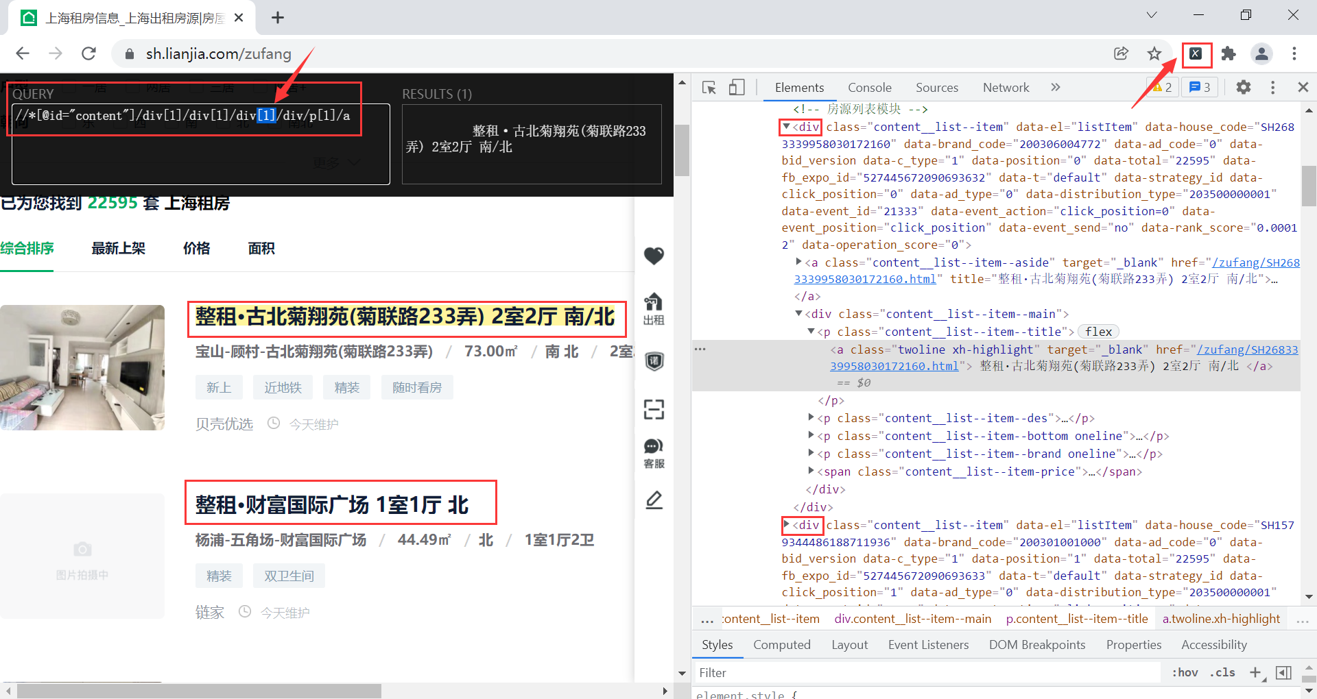 但是我们发现它只选中了第一个房源的标题,通过观察网页源代码后发现每一个房源都是用一个div标签装起来的,所以判断是否是因为倒数第二个div标签只选择了第一个div标签的原因,去除[1]之后就可以选中该页面所有的标题。