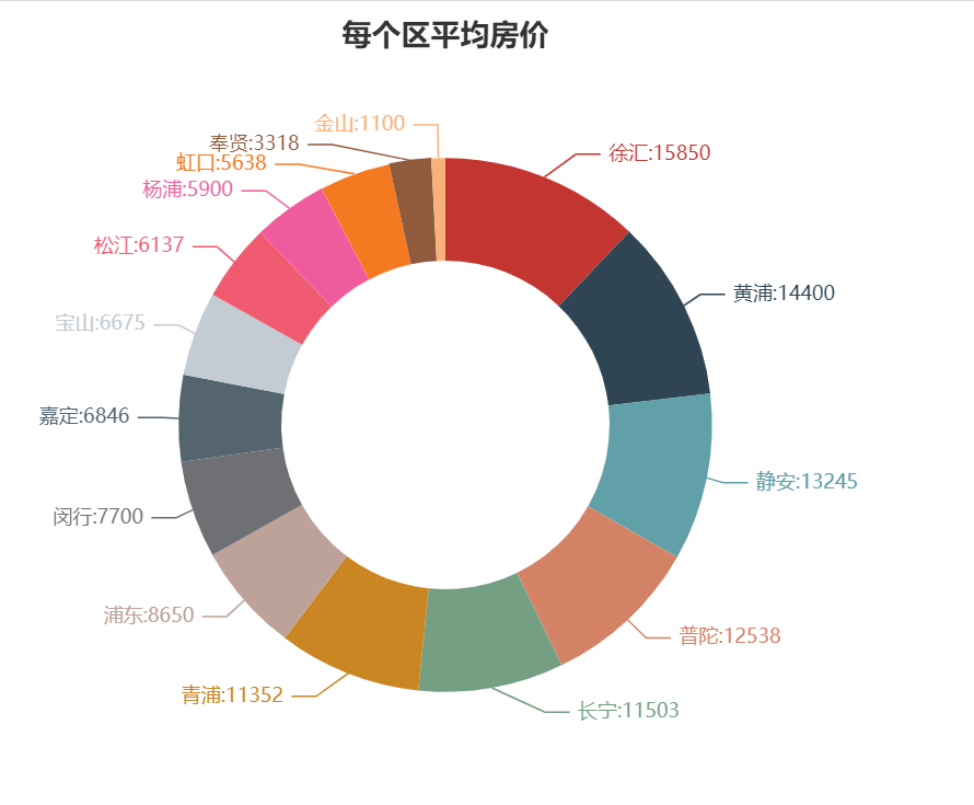 # 导入相关模块与所需包 from pyecharts.charts import * from pyecharts import options as opts # 导入写好的连接数据库的包 import sql as s # 查询每个区平均房价 # 执行sql语句 s.cur.execute("""SELECT district,ROUND(AVG(price),0) FROM lj_sh GROUP BY district ORDER BY AVG(price) DESC;""") data = s.cur.fetchall() print(data) # 画图 ( Pie() # 饼图 # 导入数据 设置内外半径 设置标签样式 .add("", data, radius=["40%", "65%"], label_opts=opts.LabelOpts(formatter="{b}:{c}")) .set_global_opts( # 设置标题 设置标题位置 title_opts=opts.TitleOpts(title="每个区平均房价", pos_left='center'), # 设置不显示图例 legend_opts=opts.LegendOpts(is_show=False) ) # 进行图形渲染 .render("test1.html") )