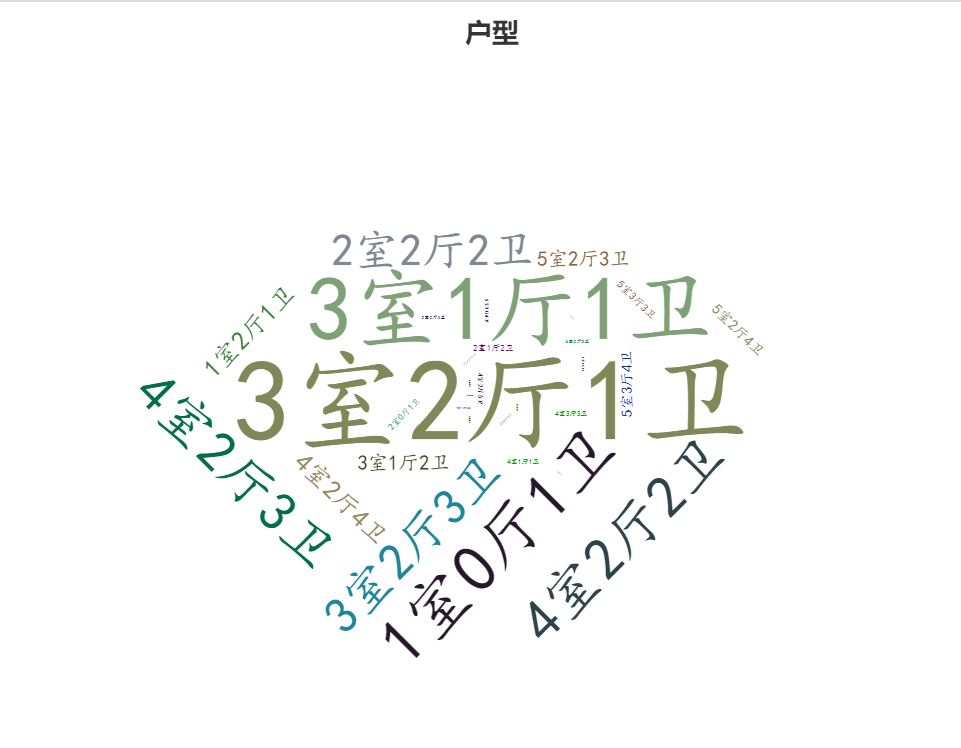 # 导入相关模块与所需包 from pyecharts.charts import * from pyecharts import options as opts # 导入写好的连接数据库的包 import sql as s # 查询户型及或许数量 s.cur.execute("""SELECT house_type, COUNT(house_type) FROM lj_sh GROUP BY house_type;""") # 获取所有查询得到的数据 data = s.cur.fetchall() data = [i for i in data] print(data) # 画图 chart = ( WordCloud() # 词云图 # 添加数据,设置字体格式 is_draw_out_of_bound: bool = False .add("", data, word_size_range=[1, 300], textstyle_opts=opts.TextStyleOpts(font_family="cursive")) .set_global_opts( # 设置标题,位置 title_opts=opts.TitleOpts(title="户型", pos_left="center") ) # 图形渲染 .render("test1.html") )