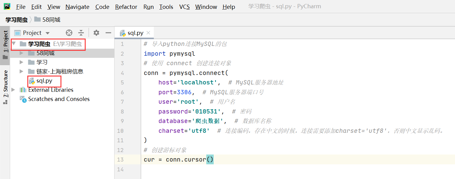 # 导入python连接MySQL的包 import pymysql # 使用 connect 创建连接对象 conn = pymysql.connect( host='localhost', # MySQL服务器地址 port=3306, # MySQL服务器端口号 user='root', # 用户名 password='010531', # 密码 database='爬虫数据', # 数据库名称 charset='utf8' # 连接编码,存在中文的时候,连接需要添加charset='utf8',否则中文显示乱码。 ) # 创建游标对象 cur = conn.cursor()