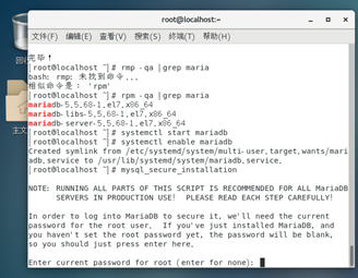 (ps:这里我遇到了问题,它让我输入正确的root密码,我尝试自己设置,或者尝试mysql可能自带的root默认密码,但都爆错;其实只要仔细看上边的提示段,翻译一下就是,如果你刚装MariaDB,默认密码空白,直接按enter跳过就行);