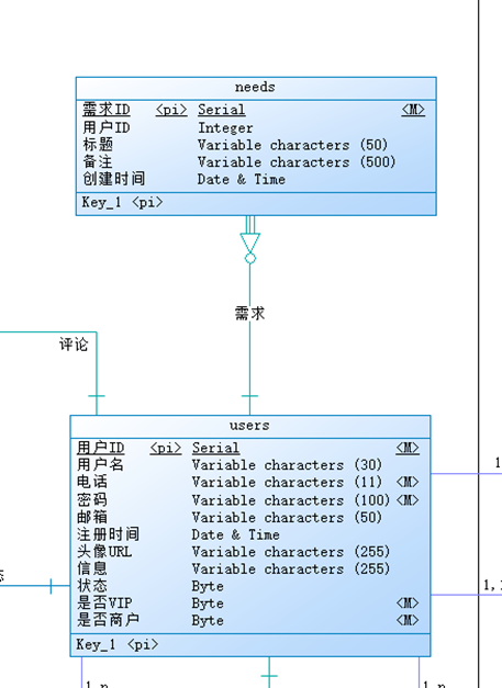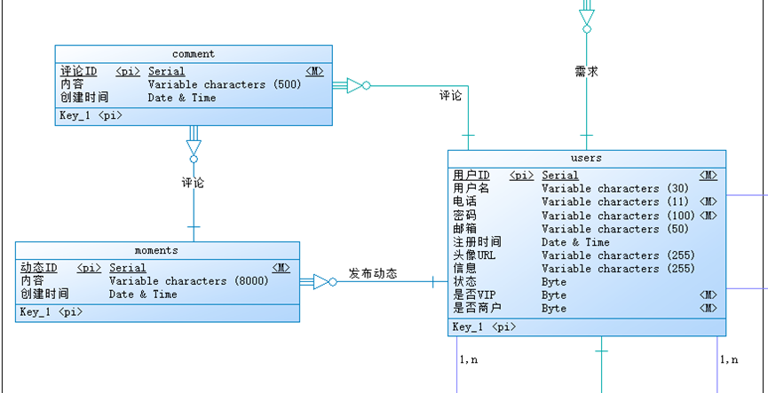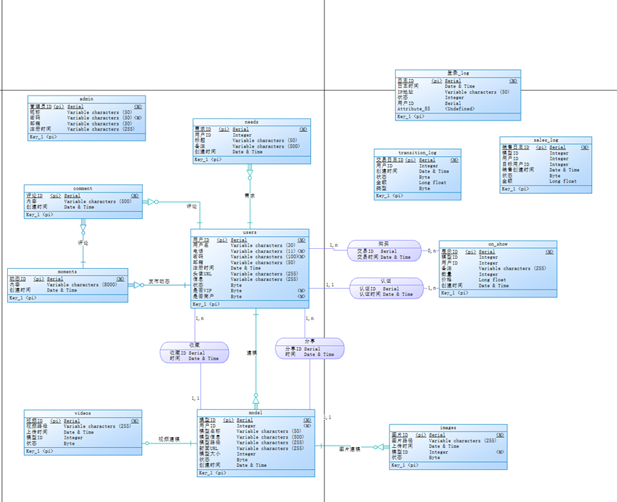 - E-R模式中我们充分考虑了用户上传图片或视频建模、分享收藏模型建模、发布和评论动态建模、认证文商户发布模型建模、用户发布需求建模,并给出了全局E-R图