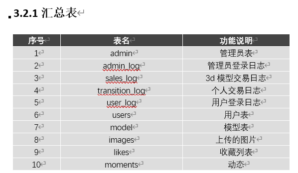 我们数据库是一套基于手机拍照的三维重建系统的数据库。该系统允许用户通过手机拍照或录像创建三维模型,并支持模型下载和分享。数据库设计分为外部、结构和应用三个部分。在外部设计中,确定了使用MySQL作为数据库软件和easymodel作为数据库名称。结构设计包括概念、局部E-R和全局E-R图设计。逻辑结构设计列出了各表的名称、功能、数据类型和外键等信息。应用设计涉及数据字典和安全设计。文本重点描述了图片、收藏、动态、评论、需求、商户发布、需求满足、分享和视频等表的设计,以及管理员、登录日志、销售日志、交易日志、用户登录日志和模型等物理结构表。最后,提供了创建这些表的SQL语句。整个数据库模型设计清晰,能够有效地描述和管理数据。