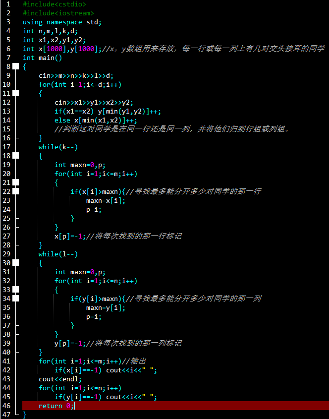 试题分析:题目要求是寻找最多能分开多少对交头接耳的同学,所以我们就要用贪心,我们可以在输入时就将每一行或每一列上可以分开多少同学就存好,然后进行比较,依次将最大的找出,最后输出即可。