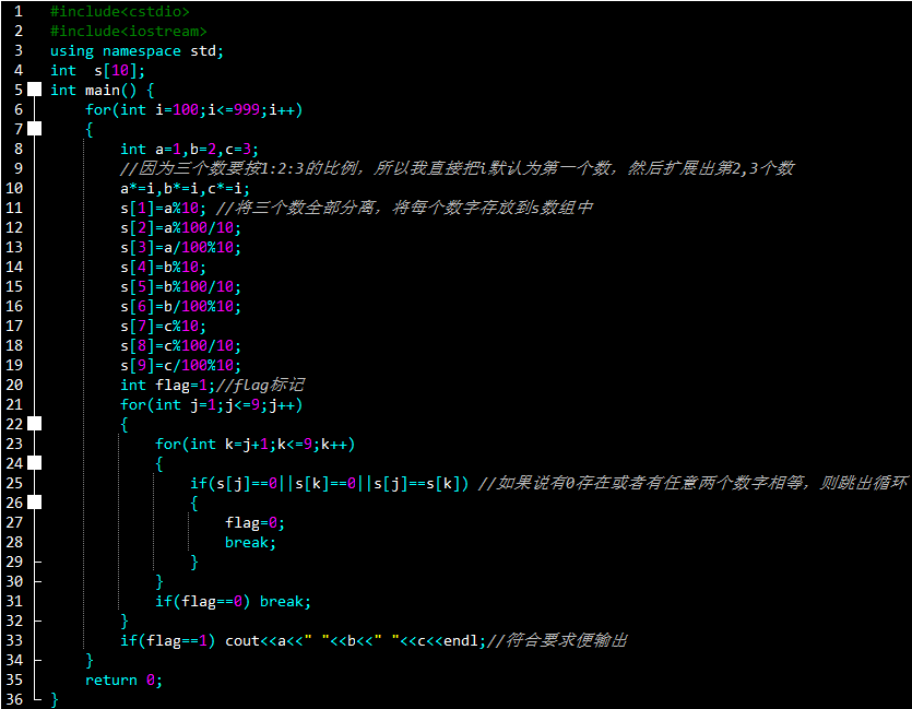 试题分析:题目要求三个三位数是由1~9中分成三组组成的,也就是说三个数中每个位数上的数字都不相同,然后三个三位数要符合1:2:3的比例关系,所以我们可以直接将i看做第1个三位数,剩下的两个分别*2,*3,这样就满足了1:2:3,然后我们将每个数字都分离出来,并进行比较,判断(这里的三位数组成中不可以带有0),符合条件的输出即可。