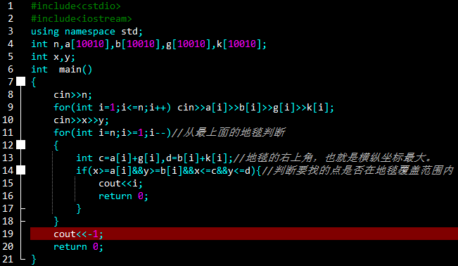 试题分析:题目要求寻找指定坐标的最上面的地毯是几号,没有则输出-1,所以我们可以从最上面的地毯开始遍历,给了我们地毯的左下角坐标(也就是横纵坐标最小)和地毯的长宽,我们就可以求出地毯的右上角坐标(也就是横纵坐标最大),然后看指定坐标是否在范围内,若在,则输出地毯号;不在,则继续遍历下一个地毯。
