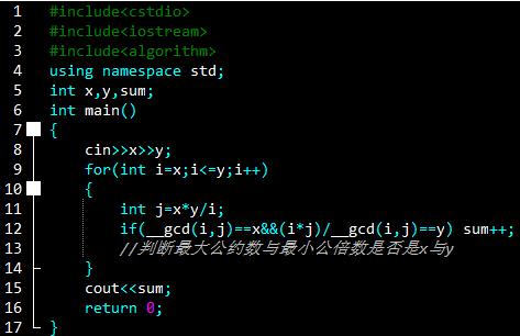 试题分析:题目输入x为最大公因数,y为最小公倍数,所以我们可以直接从x开始遍历,运用了<algorithm>库中的__gcd(i,j)函数(求i与j的最大公因数的函数),再根据“两个数最大公约数与最小公倍数的乘积即为这两个数的乘积”这一定理可以求出最小公倍数(i*j/__gcd(i,j)),然后进行判断即可。