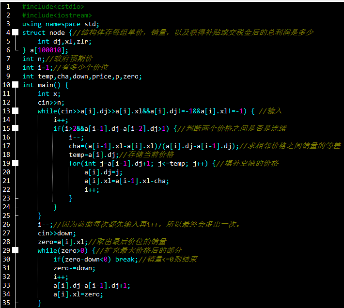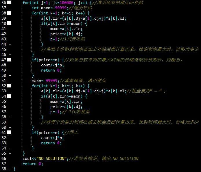 然后我们要进行比较,比较每次税金或者补贴中总利润最大的价格是多少,再将价格与预期价对比,若相等,则输出税金或补贴,结束程序,否则,输出“NO SOLUTION”。