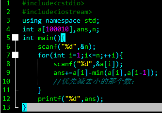 每次输入的数,如果比前一个数小,那么减前一个数时就可以顺便把他减掉,如果大于则还得自己减。