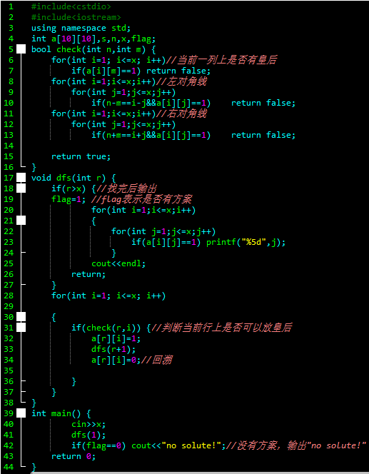 试题分析:由八皇后问题,我们可以推出n皇后问题的解法,我们定义了一个函数用来检查当前列,当前对角线是否有皇后(因为我们是一行一行遍历,所以不需要检查行),如果可以放置,我们就放置并标记。再继续寻找下一行。最后如果有方案,我们就将flag赋值为1,如果flag=0则证明没有方案。