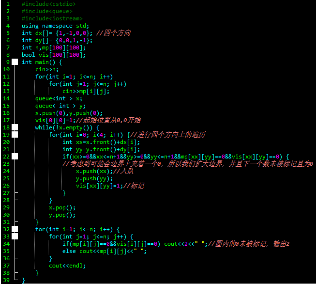 首先,我们将起始位置放到队尾,然后,在队列不为空的情况下,我们要一直取队首并拓展,寻找与第一个0相连的所有0(也就是圈外的0)并标记。最后在输出时,只要将所有的未被标记的0输出2即可。
