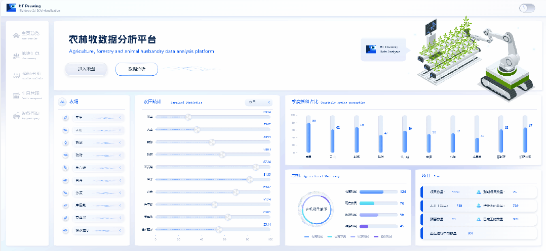 在图扑 HT 数据分析界面,展示了重点作物农场产量排行和近年来重点作物产量浮动等相关数据信息。以协助用户及时获取作物种植面积、平衡粮食区域及预测农业综合生产力。
