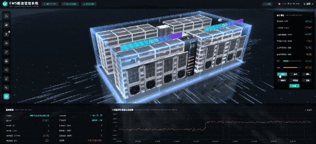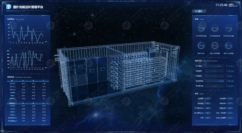 点击三维中的储能集装箱,可下钻至室内场景,储能界面展现了功率历史波动曲线、储能系统实时运行数据、各设备运行状态等。