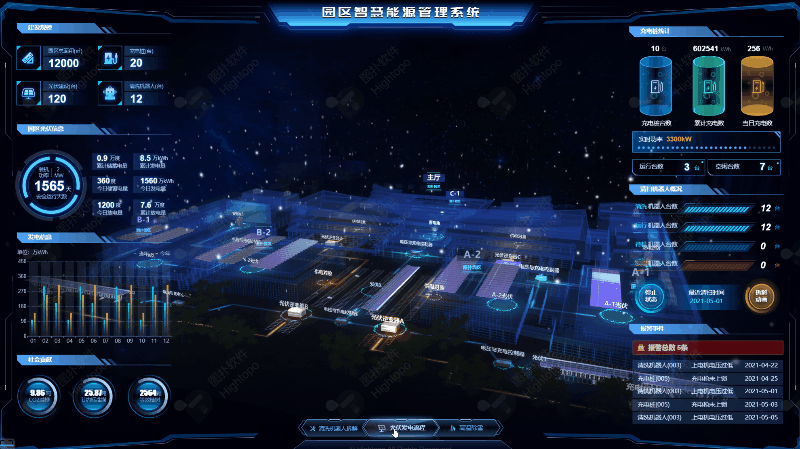 HT 园区能源管理可视化监视大屏界面,结合物联网数据采集,通过 HTTP 或 WebSocket 等协议接口将实时数据传给前端页面。大屏界面作为驾驶舱的角色,采取一张图的形式,提炼园区关键数据展示,当数据变化异常时,支持跳转至各业务系统进行管理。
