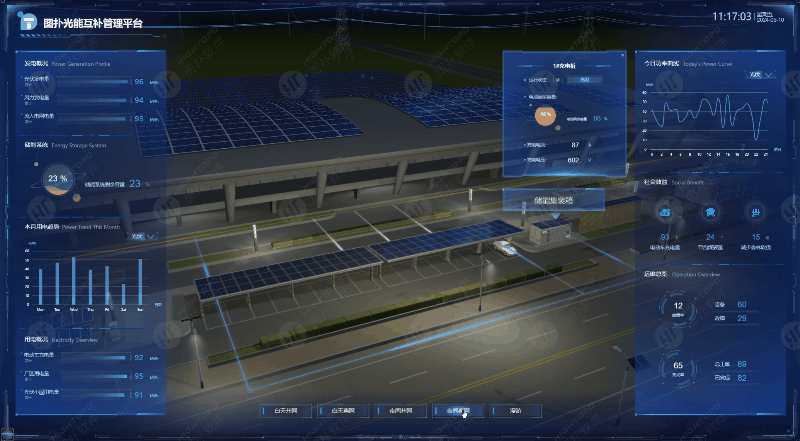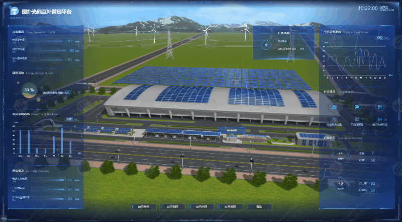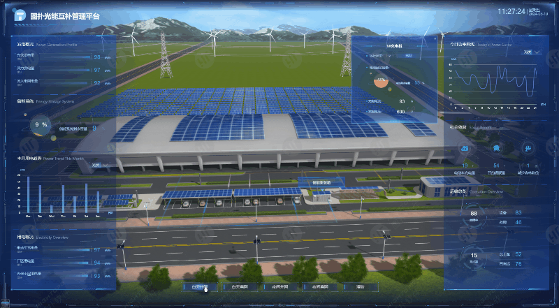 图扑利用自研产品 HT for Web 搭建风光储园区可视化监控系统,整合风力发电、光伏发电和储能系统,实现了能源的多元化生产和储备,提高了能源利用效率,增强了电网的稳定性和可靠性。在这一体系中,风电、光伏和储能各自扮演着重要的角色,并且相辅相成。