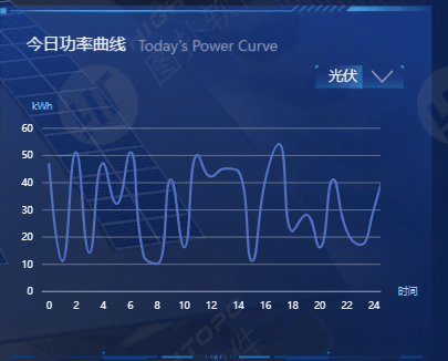 直观展示当日累计的光伏、风机、入网电量;运用曲线图形式展示功率随时间变化的波动曲线,支持切换风电、光伏、储能三种类型。