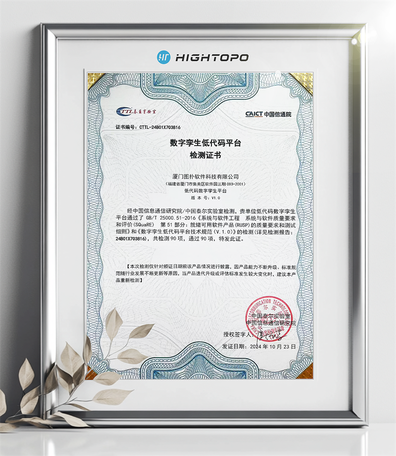 2024 年 10 月 31 日,在首届数字孪生技术与产业发展大会上,中国信息通信研究院颁布了第四批数字孪生低代码测评结果。厦门图扑软件科技有限公司自主研发的“数字孪生低代码平台”产品,顺利通过 90 项严格测评,荣获中国信通院检测认证证书。