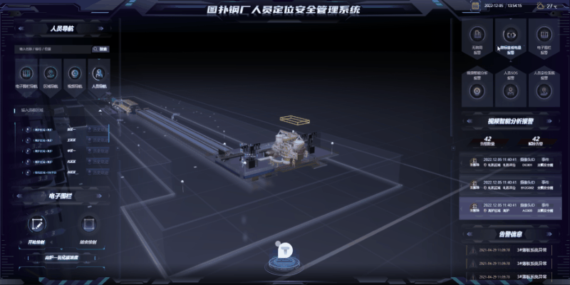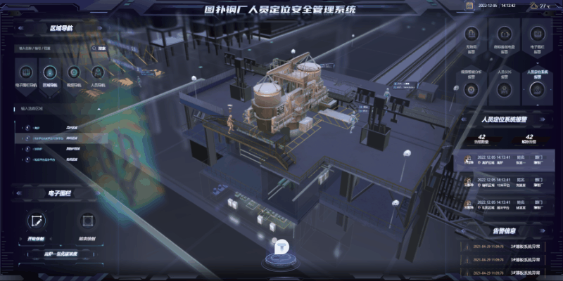 依托图扑自研 HT for Web 产品,从数字孪生钢厂出发,将钢厂厂区、设备机械、作业人员高度集中。并基于 UWB 精准定位技术,让位置数据与可视化业务流程直接关联,实现 3D 可视化监控车间作业人员的精准定位、历史轨迹溯源、电子围栏监管及异常预警告警等业务功能。形成基于 UWB 精准定位的调度一体化、数据透明化、运维智能化的监管平台。