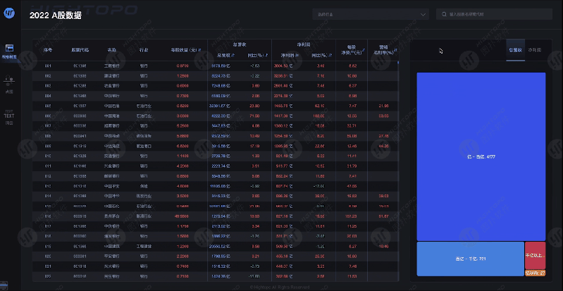 股票数据呈海量化、密集化、多样化的趋势。为了更清晰的比对股票数据,图扑基于自研 HT for Web 产品的 2D 编辑器、UI 库,对 2022 年 A 股市场数据以 BI 报表形式设计呈现,应用丰富的图表组件,将 A 股总营收、净利润、同比变化等维度的市场数据,选以表格、矩形树图、点图、词云多种动态图表方式,进行清晰、简洁的呈现。