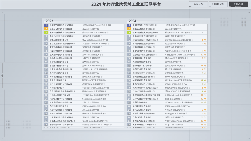 通过图扑搭建的对比表格,用户可以直观地观察到 2023 年和 2024 年“双跨”平台清单的排序变化。利用箭头趋势的标识、翻牌动画让这些调整一目了然。
