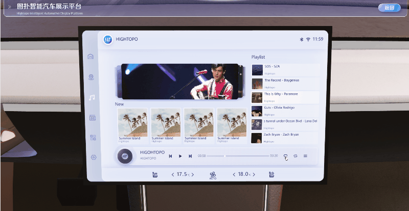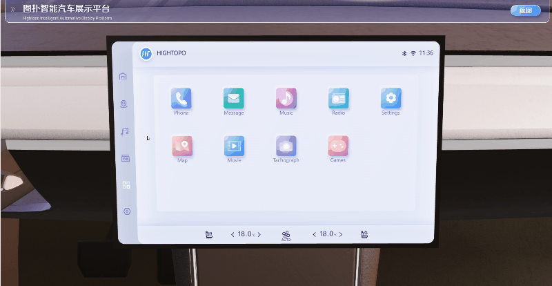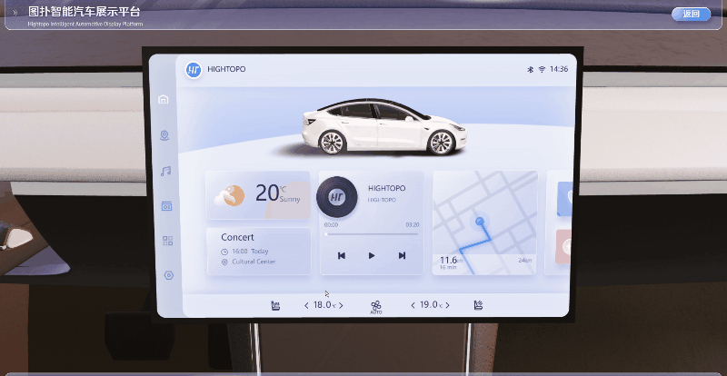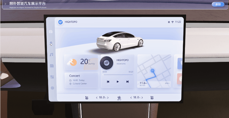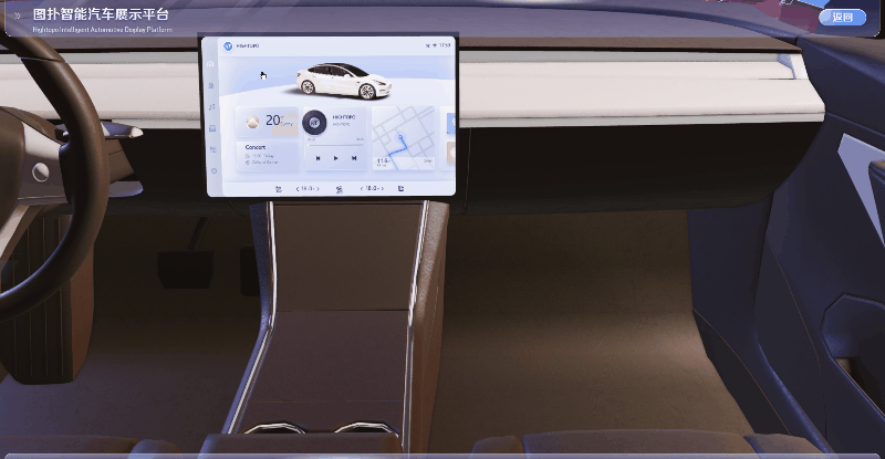 在图扑汽车展示平台中,通过将 3D 汽车模型与 2D 操作系统巧妙融合,并集成在三维中控台中,创造出一种高度立体和真实的交互体验。无论是调节温度、切换音乐,还是设置导航等操作,用户都可以通过该界面轻松实现操作。