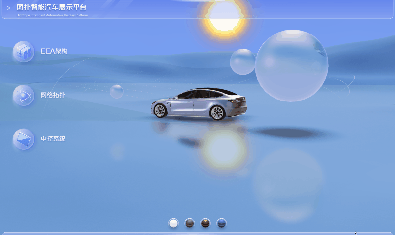 通过图扑软件自研的 HT for Web 产品的二三维协同设计工具、2D 组态以及 3D 组态、低代码开发等各类可视化工具搭建智慧汽车展示平台。整体视觉上使用了光感亮色,搭配镜面效果+流动线条+动态重力元素让系统更加生动,充满活力。